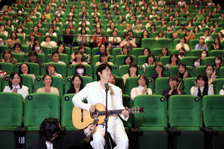 歌のプレゼントを受け取った福山さんは、満面の笑みで何度も感謝の言葉を伝えます。そして、「本日より公開となりましたライブフィルム『FUKUYAMA MASAHARU LIVE FILM@NAGASAKI 月光 ずっとこの光につながっていたんだ』。音も映像も緻密に積み上げ、スタッフのみなさんのおかげでかなり濃密な作品になりました。一度でも十分なのですが、何度も観ていただくと新しい発見があると思います。よろしくお願いします」とメッセージを届け、再び大声援に包まれて舞台挨拶は幕を閉じました。