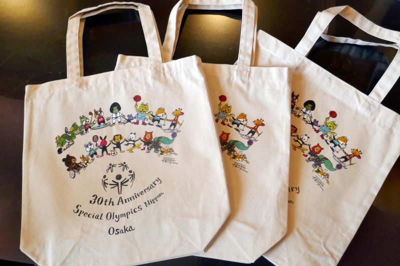 参加者に配られたのは、絵本作家 谷口 智則さんが描いた記念イラストのトートバック。いろいろな動物たちが手を取り合って楽しく競技するイメージです。